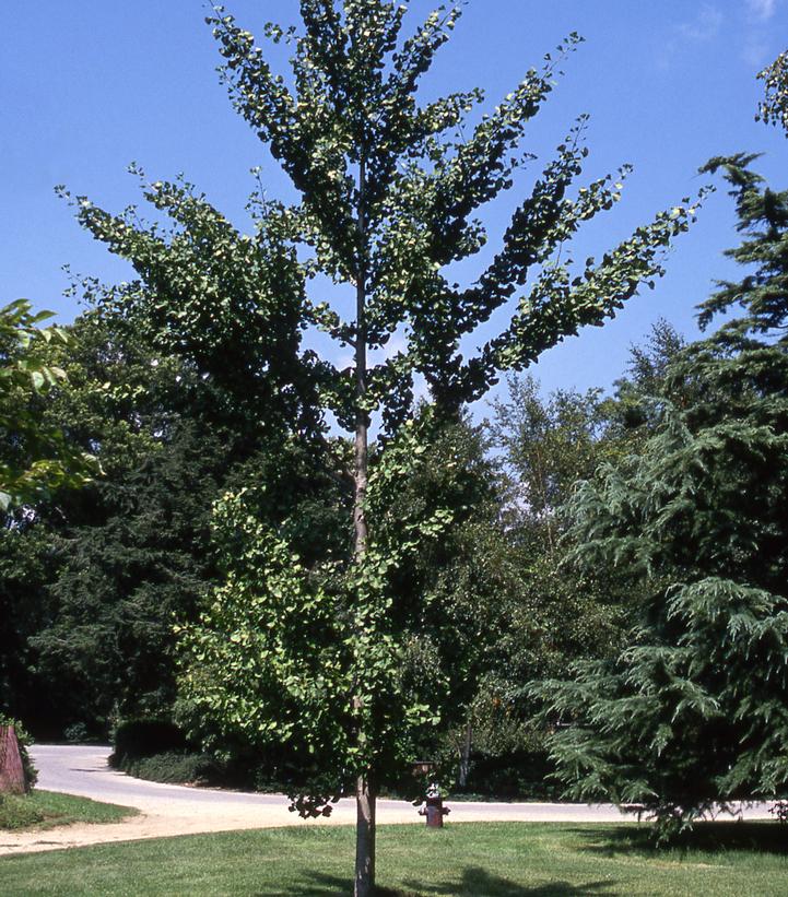 Ginkgo is an anomoly… it is an ancient plant that has survived from its first appearance some 200 million years ago and it is the only deciduous conifer in existance today. This singularity of backround leads to a singularity of appearance with unique, fan shaped foliage of deep green that clothes this pyramidal tree giving it a different look than other shade trees. This different look does not mean it is a tree that is difficult to grow. On the contrary, 'Autumn Gold' is so easy and tolerant that it is the perfect plant for putting up with city streets and rough soils without a flinch. Better yet, you'll love the fall color as the fan shaped foliage turns a shimmering gold, persists on the tree for a time, then falls all at once to produce a carpet of gold underneath it.