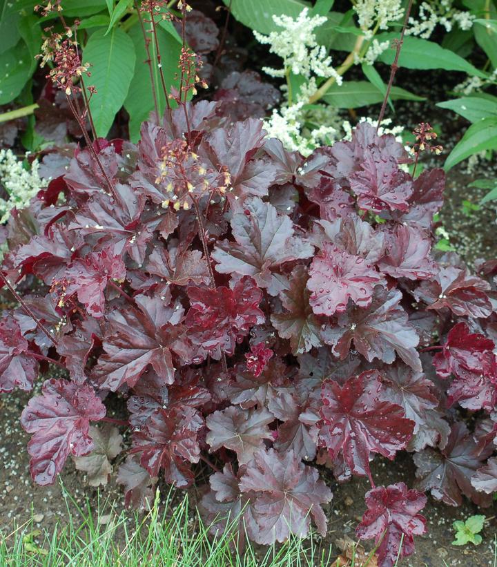 You've never seen a Coral Bells like this with the deepest, darkest, almost black colored foliage that will leave you gasping with delight. This plant's foliage emerges in early spring with a glossy, deep maroon hue and quickly fills in to form a dense, spreading mound of foliage that stays dark throughout the growing season and has such an interesting shade that you will always be tempted to touch it to see if it's actually real! Long, thin flower spikes emerge from the foliage in late spring and begin to bloom in June with a cloud of small white blossoms that really stand out in contrast to the dark foliage. Plant 'Obsidian' in full sun or partial shade and in groups to provide an even bigger color impact. It's easy to grow, drought tolerant, deer resistant and even attracts hummingbirds and butterflies!