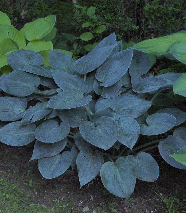 This award winning Hosta forms a dense mound of flat, spear shaped, silvery blue-green leaves that retain their blue color longer then other blue varieties. Pale, lilac-blue, bell shaped flowers rise above the foliage in August attracting butterflies and hummingbirds to the shaded garden. A slower growing hosta that takes several years to reach its mature size, its a dependable and versatile perennial requiring little and giving excellent texture and flowers to the shaded garden. Because of it smaller stature, it is the perfect Hosta for massing in the front of the garden, spotting in small, shady landscape spots or using as part of a stunning, mixed perennial and annual container for a shady deck or patio. American Hosta Society Distinguished Merit Hosta Award (1987).