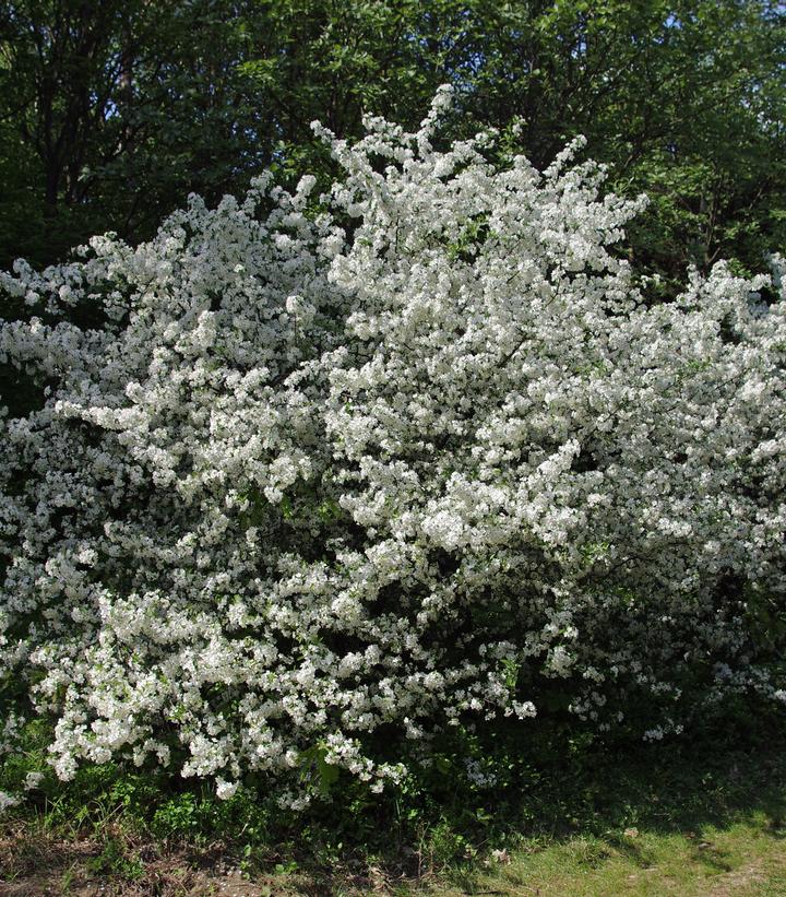 Low, dense, and spreading, this crabapple selection looks like a low, fluffy cloud on the horizon when in bloom as profuse, single red buds open to an overwhelming display of fragrant white flowers in early May. Loaded with small, bird-attracting red fruit, this plant is at home as a specimen or grouped to form a low, wide tree break in the landscape.